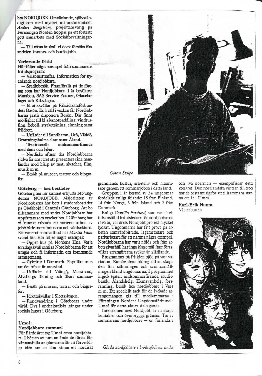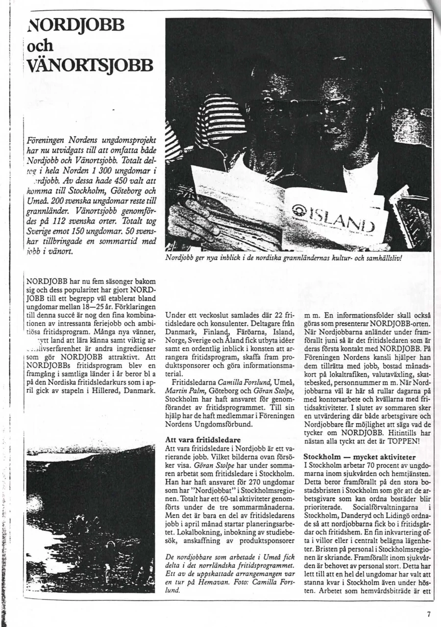 Att vara fritidsledare i Nordjobb är ett va­rierande jobb. Vilket bilderna ovan försö­ker visa. Göran Stolpe har under somma­ren arbetat som fritidsledare i Stockholm. Han har haft ansvaret för 270 ungdomar som har "Nordjobbat" i Stockholmsregio­nen. Totalt har ett 60-tal aktiviteter genom­förts under de tre sommarmånaderna. Men det är bara en del av fritidsledarens jobb i april månad startar planeringsarbe­tet. Lokalbokning, inbokning av studiebe­sök, anskaffning av produktsponsorer m m. En informationsfolder skall också göras som presenterar Nordjobb-orten. När Nordjobbarna anländer under fram­förallt juni så är det fritidsledaren som är deras första kontakt med Nordjobb. På Föreningen Nordens kansli hjälper han dem tillrätta med jobb, bostad månads­kort på lokaltrafiken, valutaväxling, skat­tebesked, personnummer m m. När Nord­jobbarna väl är här så rullar dagarna på med kontorsarbete och kvällarna med fri­tidsaktiviteter. I slutet av sommaren sker en utvärdering där både arbetsgivare och Nordjobbare rar möjlighet an säga vad de tycker om Nordjobb. Hitintills har nästan alla tyckt att det är TOPPEN!